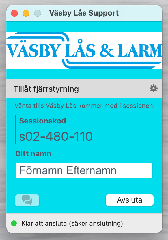 2) När du öppnar filen kommer en sessionsruta för fjärrsupport med oss att starta. I den finns ditt namn samt din sessionskod.